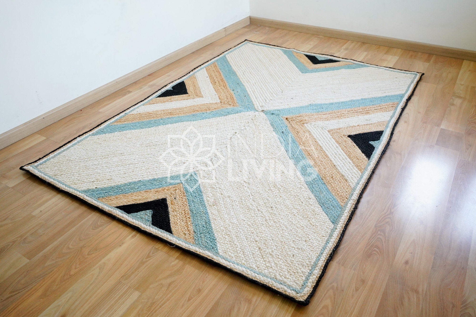Upgrade your home decor today with this stunning blue and white geometric abstract jute rug. Order now and enjoy the beauty and quality of this unique decor piece in your home.