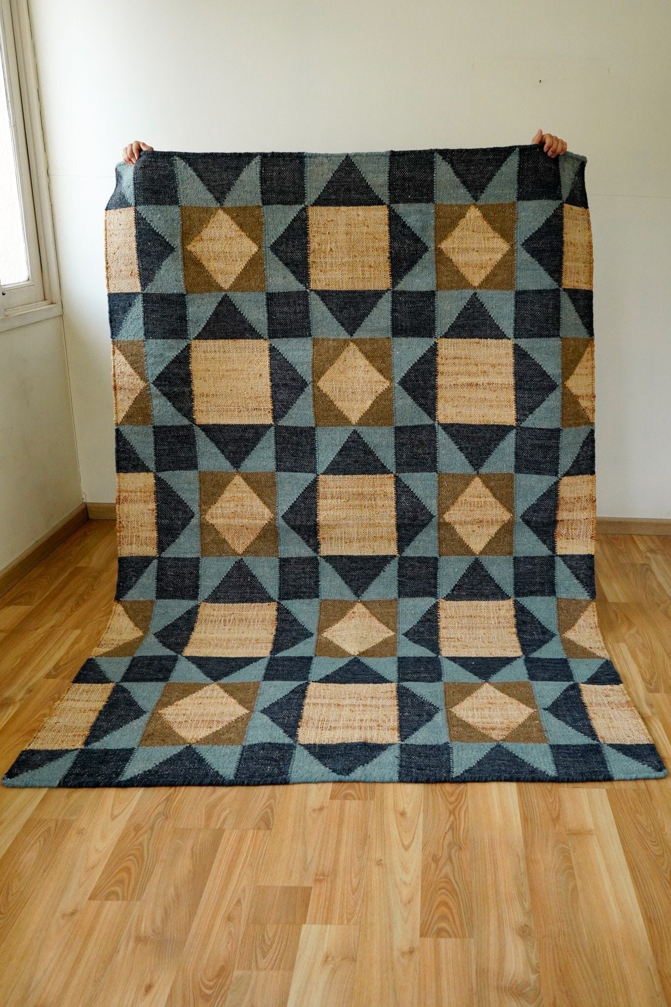 Blue Abstract wool Rug - Flat weave, Modern decor, Minimalistic, Geometric, natural jute rug