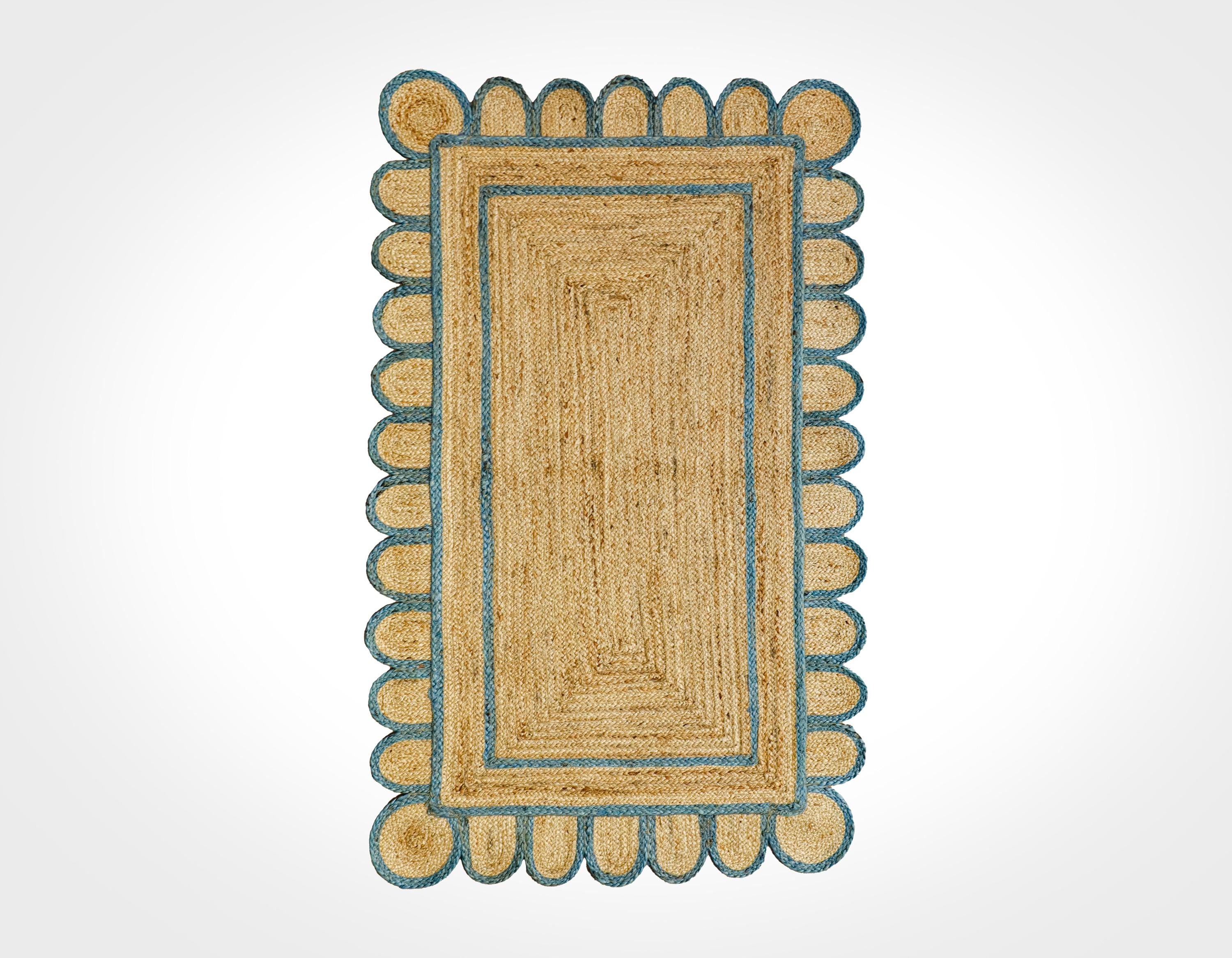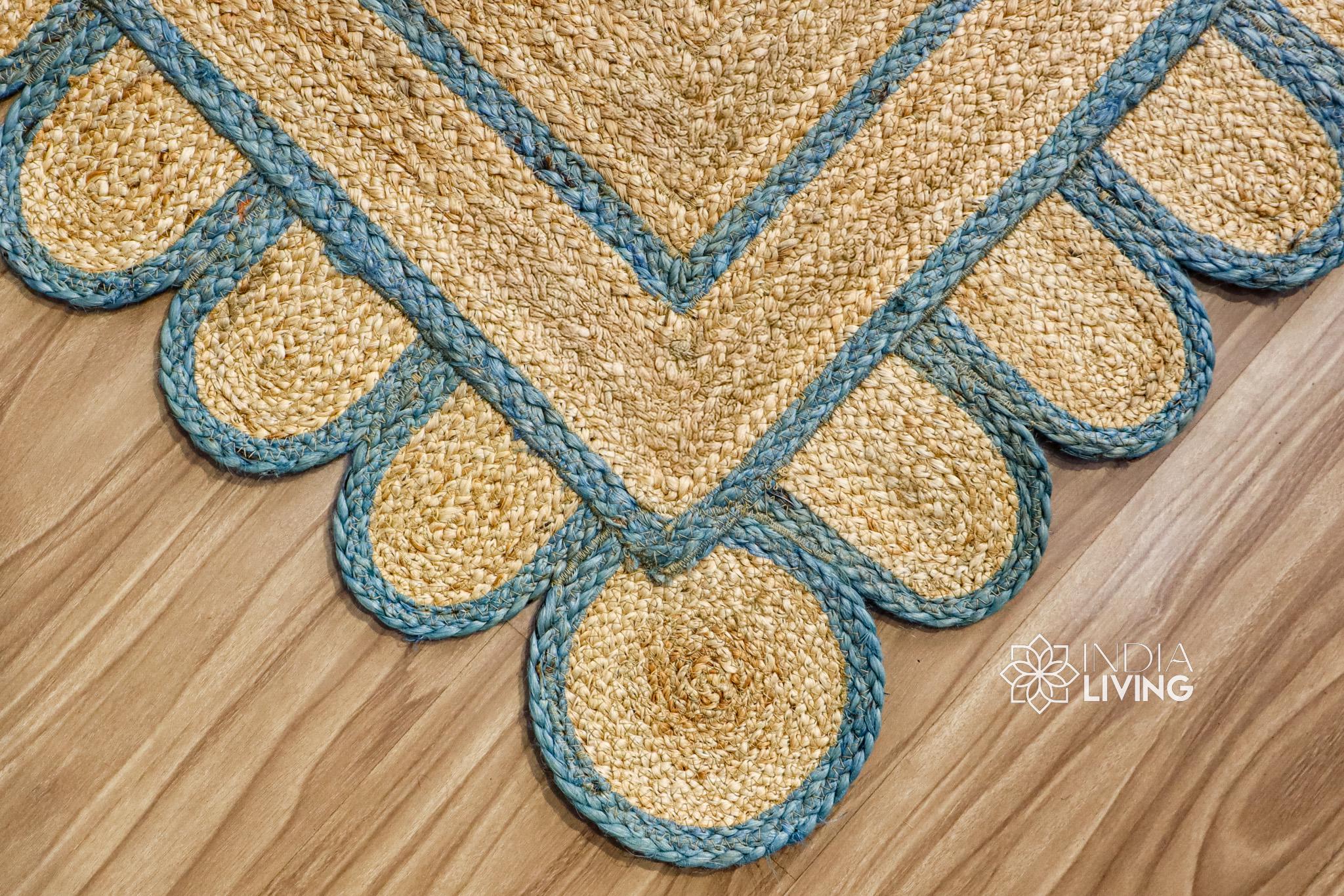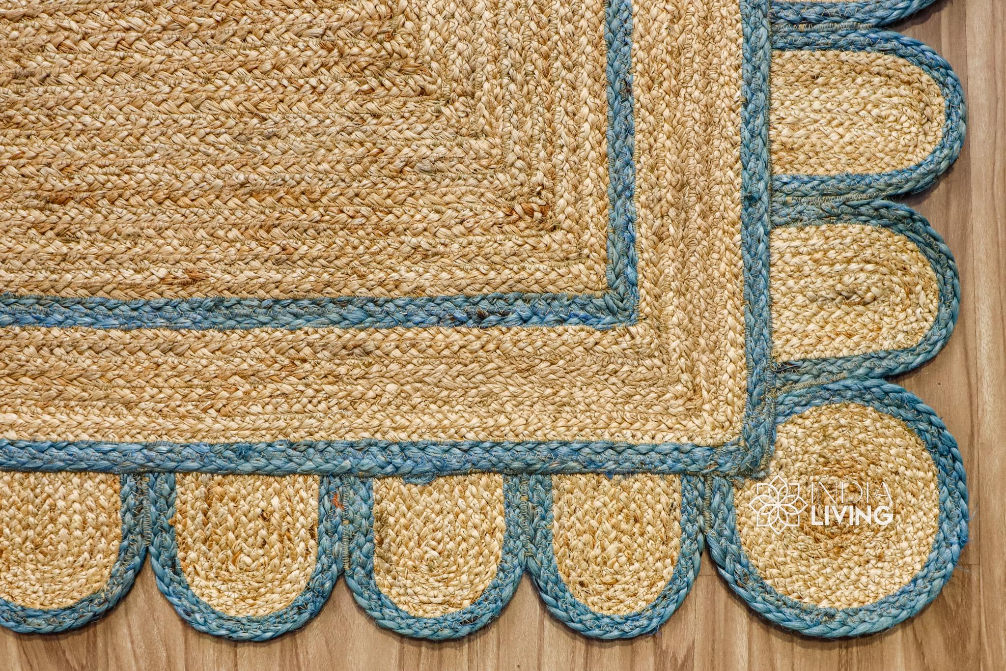 Custom Scalloped Jute Rug, Aqua Blue Border, Eco-Friendly