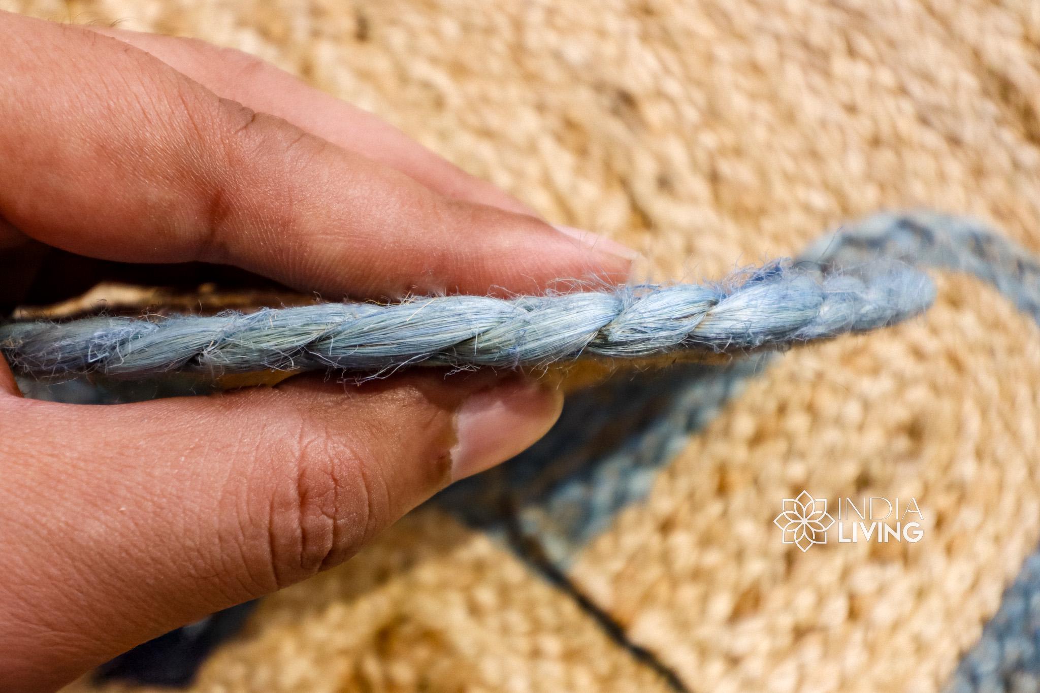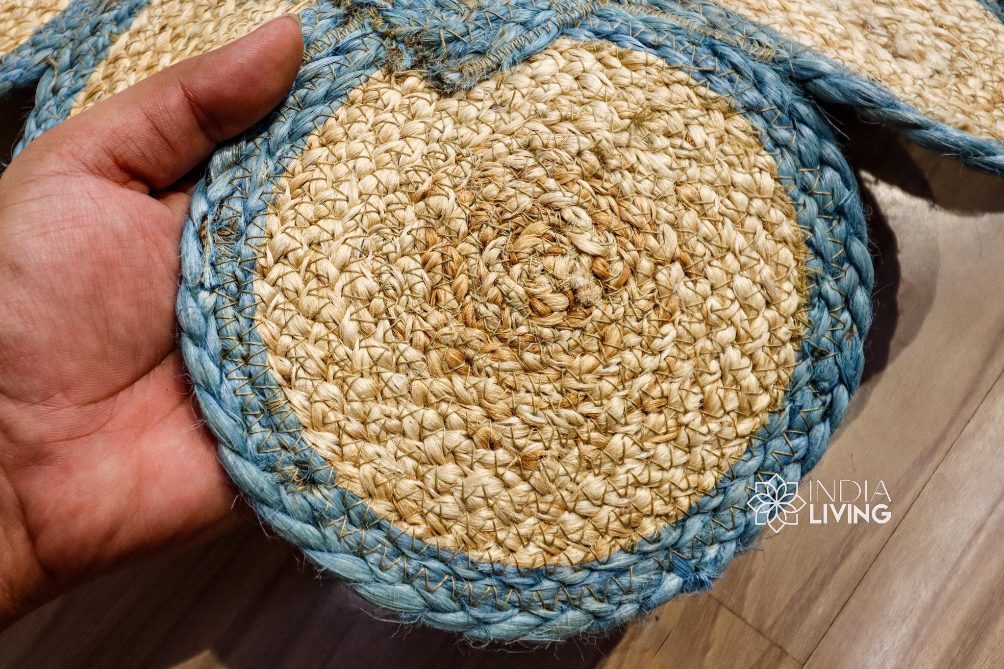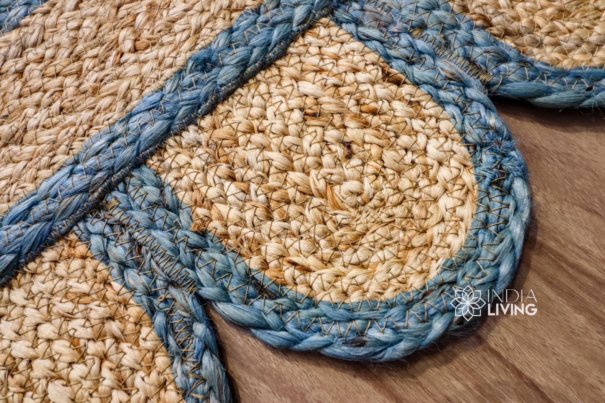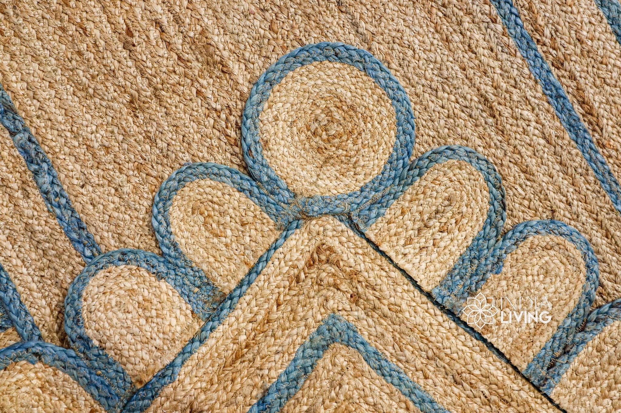 Custom Scalloped Jute Rug, Aqua Blue Border, Eco-Friendly