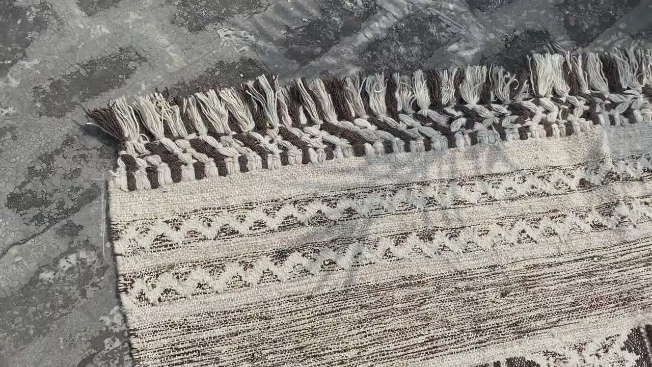 A rich textured 100% handwoven Custom-made rug with Scandanavian Minimalistic influence, enhanced with dense fringe work and knotted braids at the ends! This will be a stunning foundation anywhere it is placed in your homes for years to come.