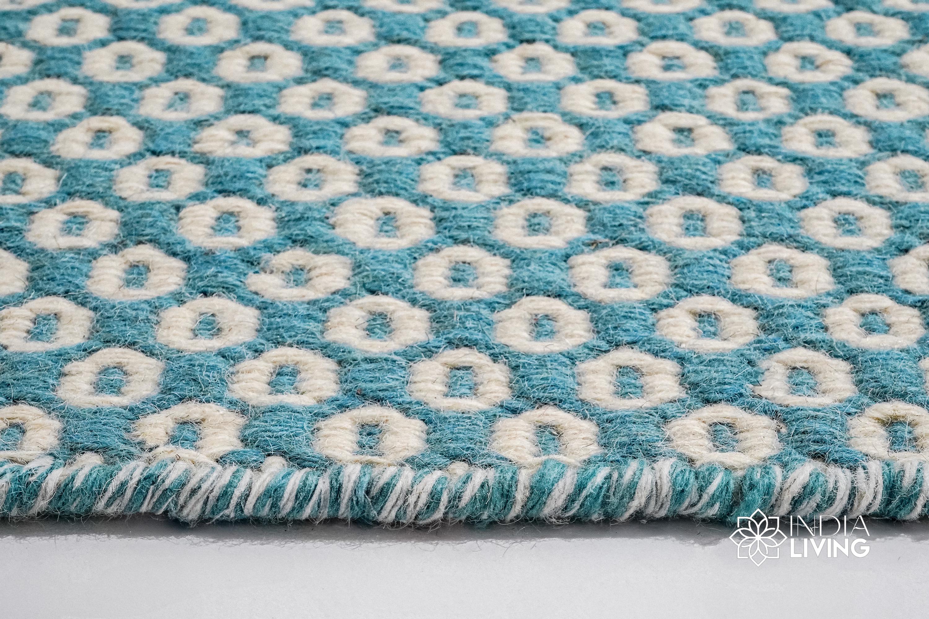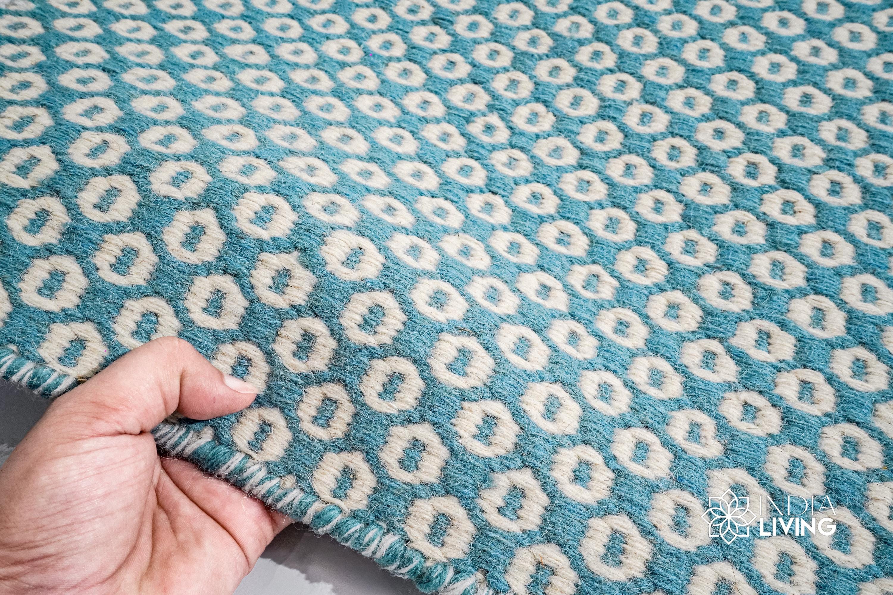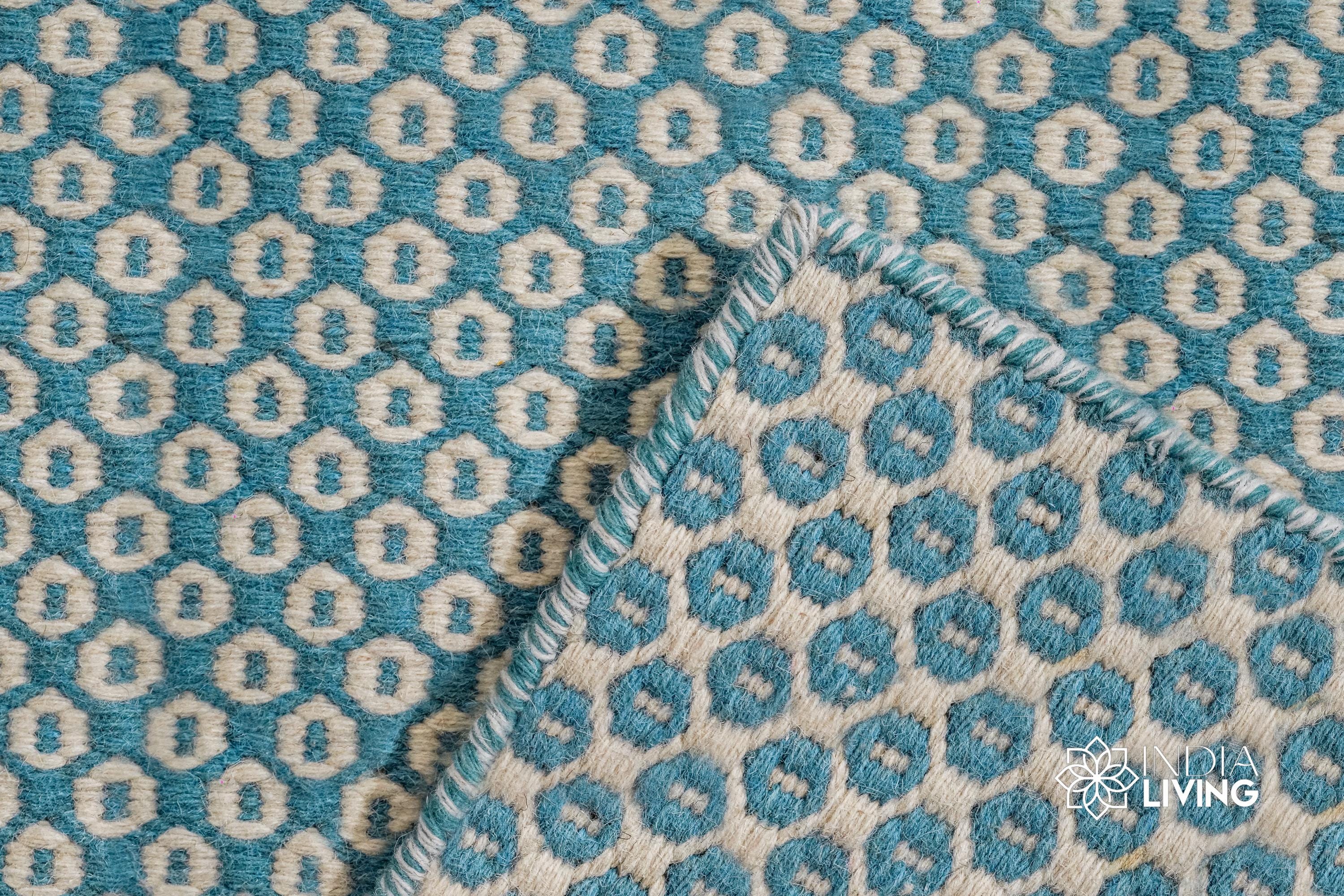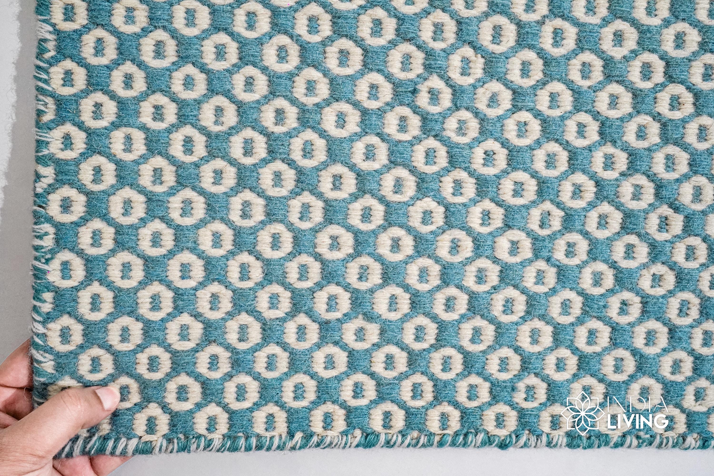 Handwoven Turquoise Blue Honeycomb Texture Flatweave Modern Boho Geometric Wool rug, Custom made in all sizes