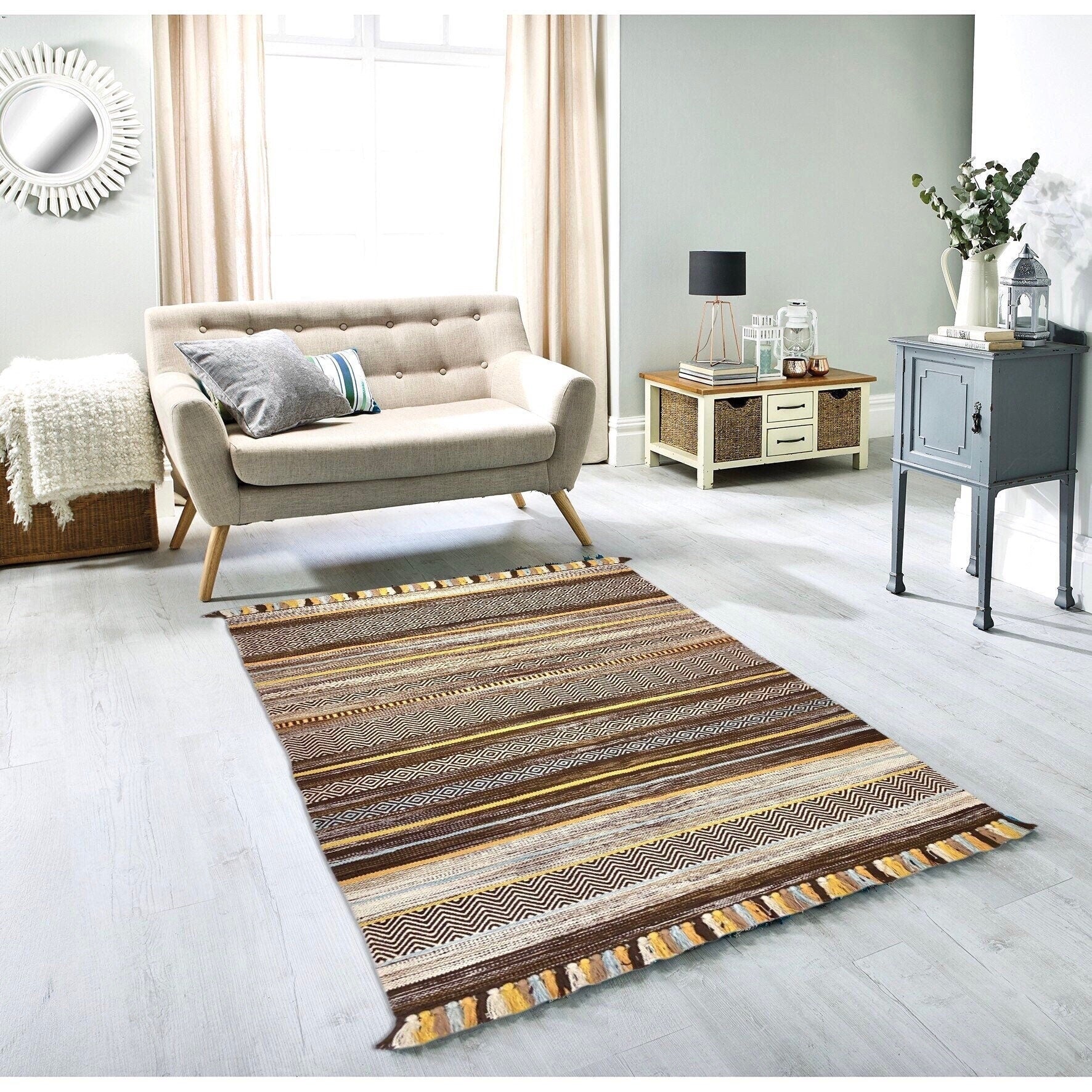 Handmade Indian Cotton Kilim Rug, Brown Flatweave with Tassels