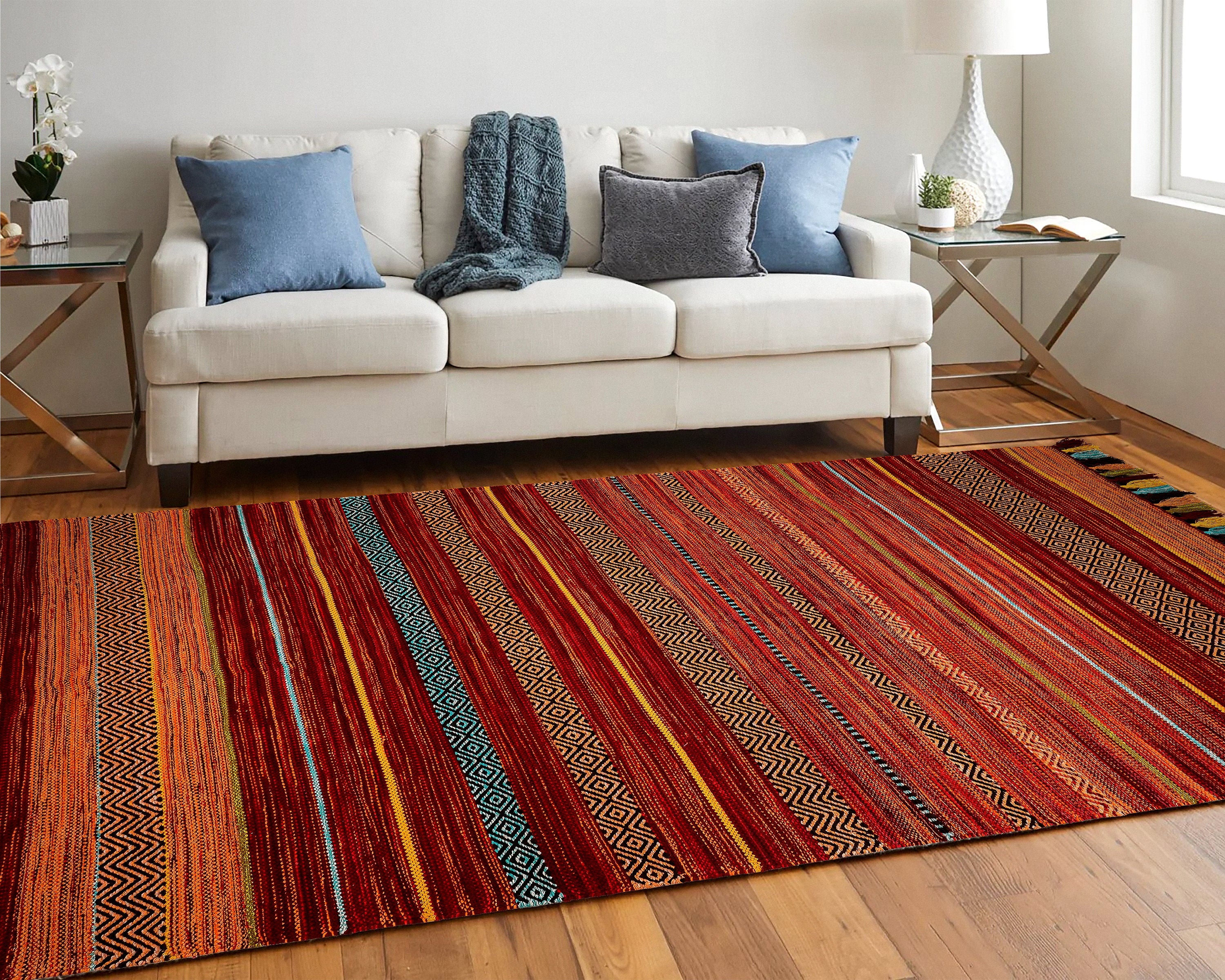 Crafted with care and precision by skilled artisans, the Kaleen rug is made from soft and durable cotton chenille, ensuring that it will last for years to come. The flat weave construction provides a smooth and comfortable surface underfoot, making it a perfect choice for bedrooms, living rooms, and dining areas.