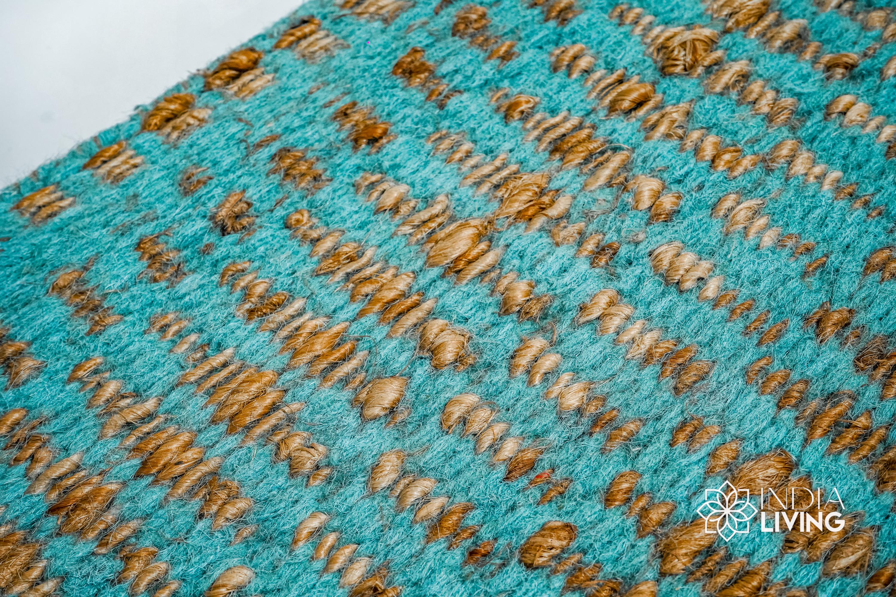 Natural Turquoise Blue Abstract Geometric Ribbed Handwoven Modern Boho Flatweave Jute rug, Custom made in any size